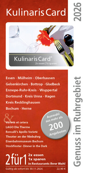 Die Kulinaris Card ist ein Gutscheinbuch mit einer handlichen Scheckkarte und ermöglicht Ihnen im Ruhrgebiet und im Münsterland eine Vielzahl kulinarischer 2für1 Erlebnisse sowie 2für1 Gutscheine aus den Bereichen Varieté, Theater, Wellness....